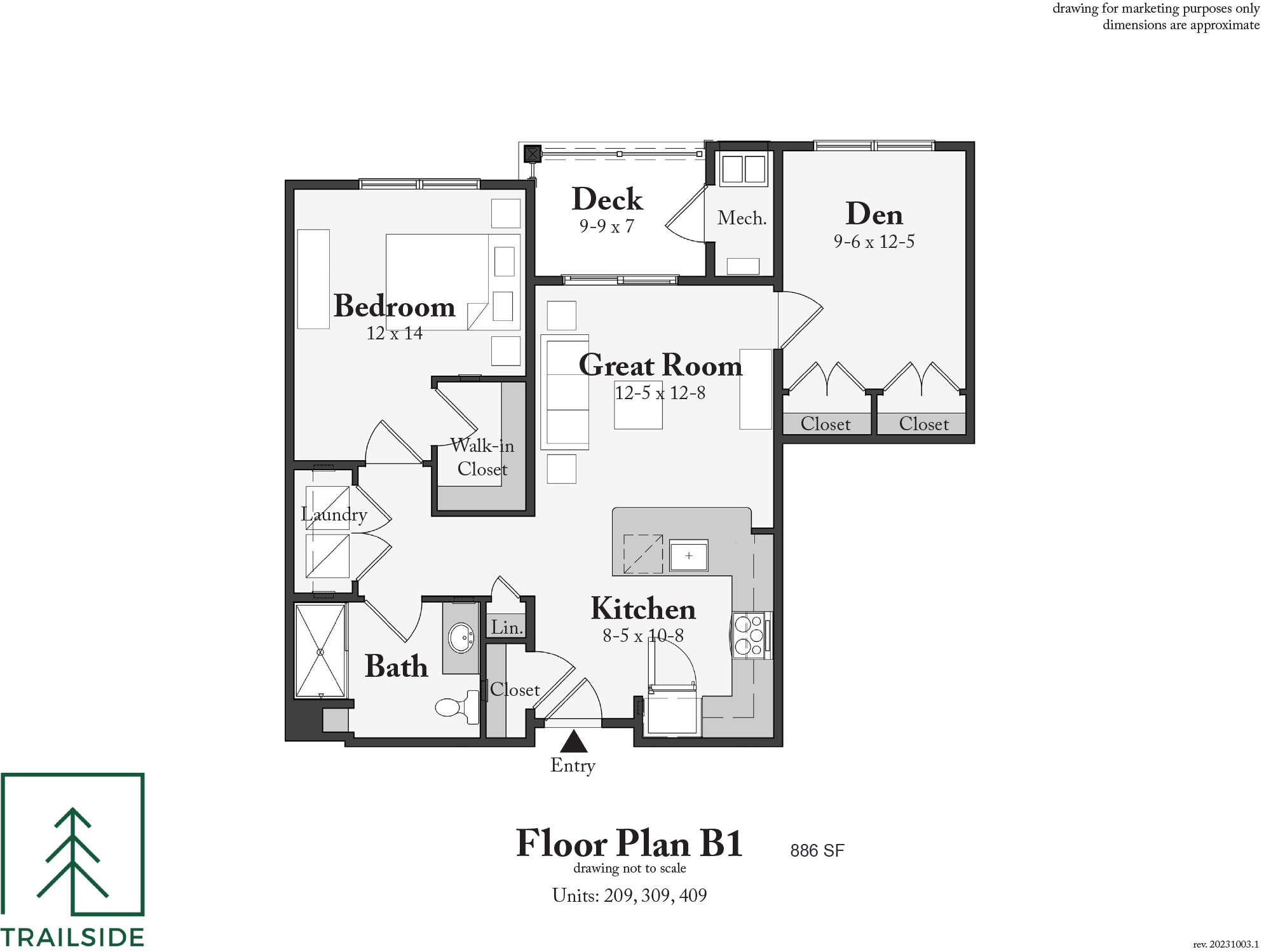 1 Bedroom, 1 bath, w/ island counter in kitchen; patio; den with two additional closets